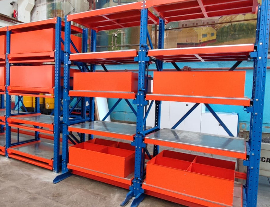 Стеллаж с выдвижными полками и электроприводом оснащён ящиками для удобного хранения и организации инструментов или материалов. Электропривод обеспечивает лёгкое и плавное выдвижение полок, сокращая физические усилия и ускоряя доступ к содержимому без лишних усилий.